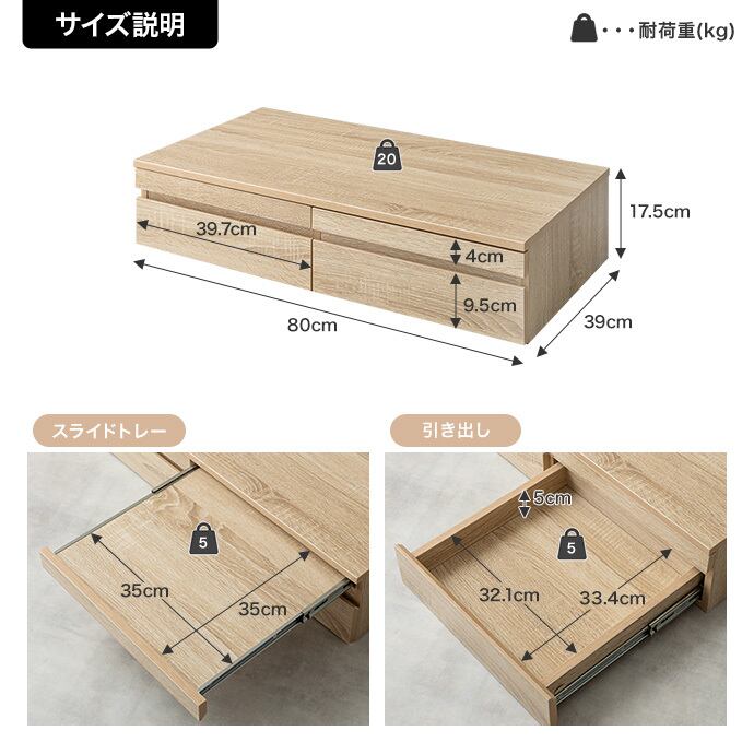 【耐荷重】天板:約20kg 、引き出し:約5kg、スライドトレー:約5kg