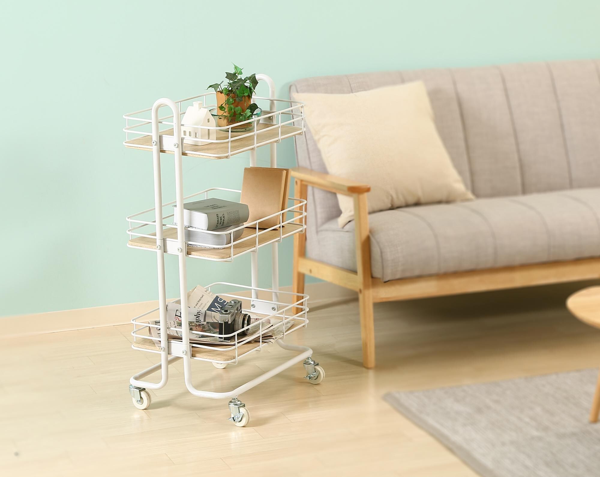 S字フックもかけられる形状なので、収納の幅も広がります。キッチンワゴンとしてはもちろん、バス用品を収納したり、観葉植物を飾ったり、用途はさまざま!キッチン回りに、ダイニングテーブルの横に、使いたい場所に手軽に移動できます。